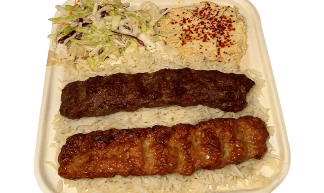 Half beef lule kabob and half chicken breast plate served on a delicious plate of rice served with cabbage salad, hummus and pita bread
