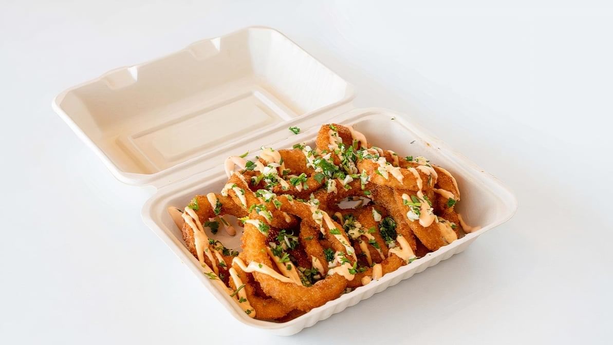 Crispy Onion Rings with Garlic, Parsley, Cilantro, topped with Jonah's Magic Sauce