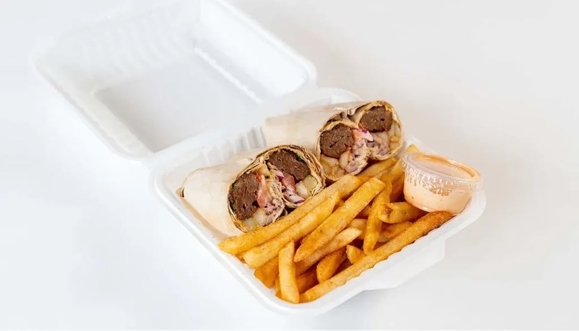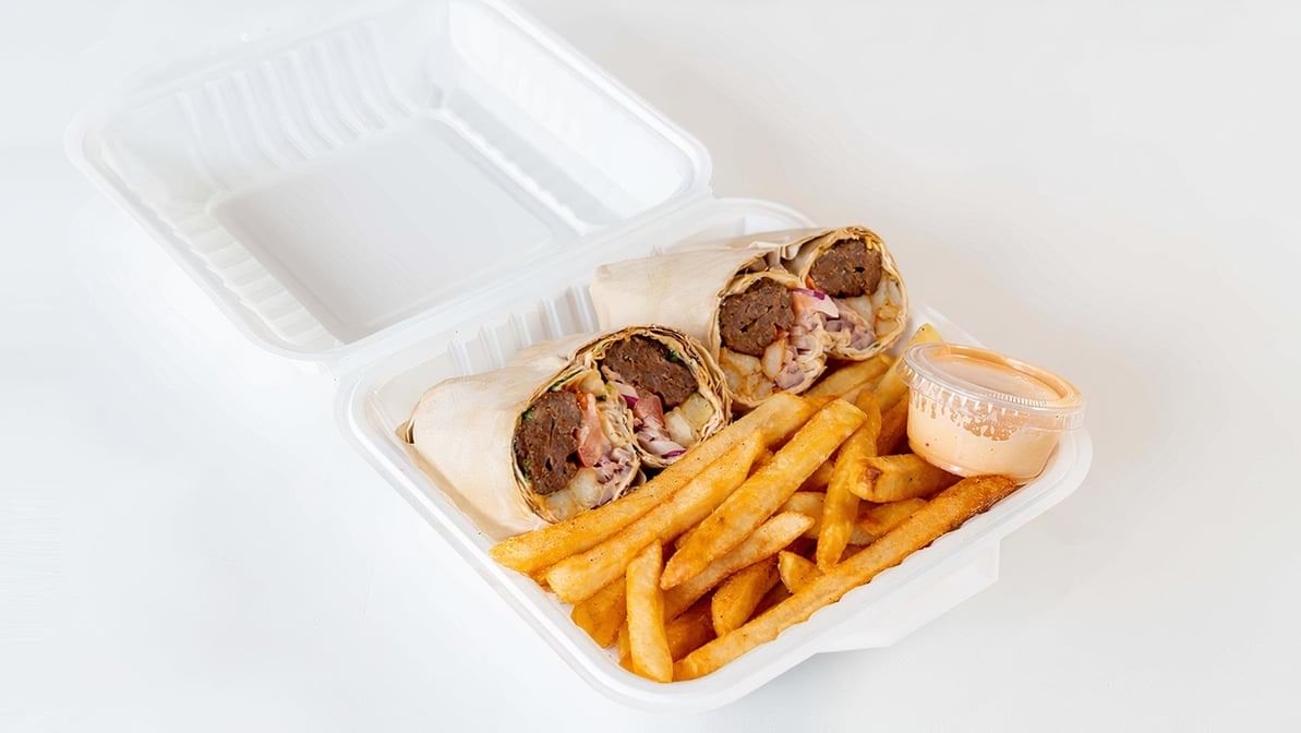 Two Beef Kabob Wraps served with French Fries, Tomatoes, Onion, Cilantro, Parsley, & Jonah's Magic Sauce