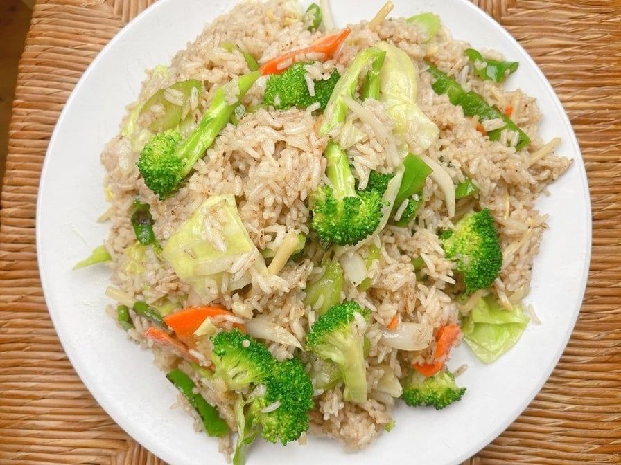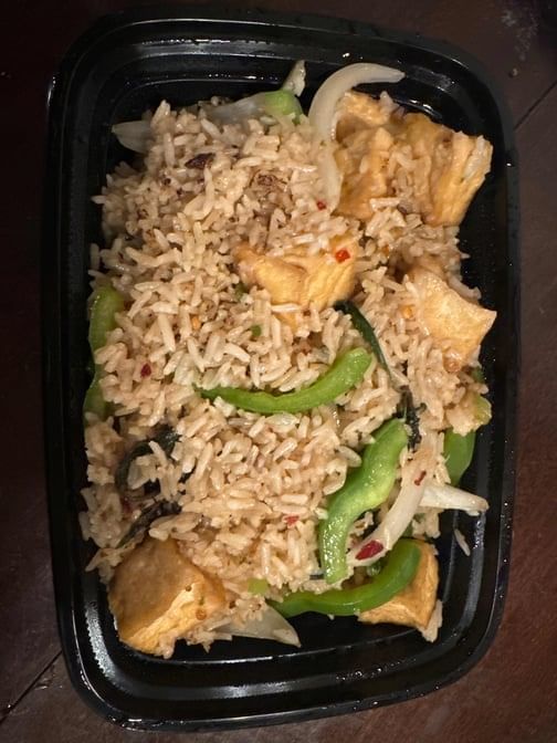 Stir fried rice with choice of tofu or mixed vegetable, bell pepper, onion, Thai sweet basil vegan spicy garlic sauce