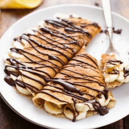 Indulge in a sweet roti with creamy banana and rich chocolate pudding for a delightful dessert experience.