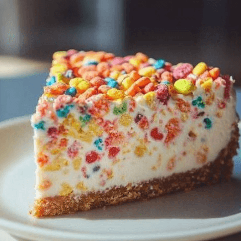 Creamy cheesecake topped with colorful fruity pebbles for a delightful crunch and burst of flavor.