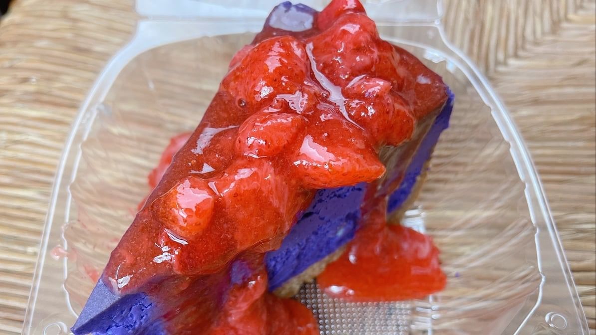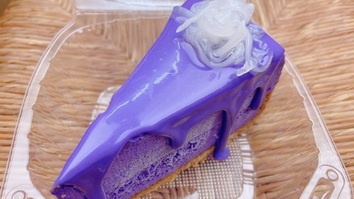 Rich ube and strawberry flavors combine in a creamy cheesecake.
