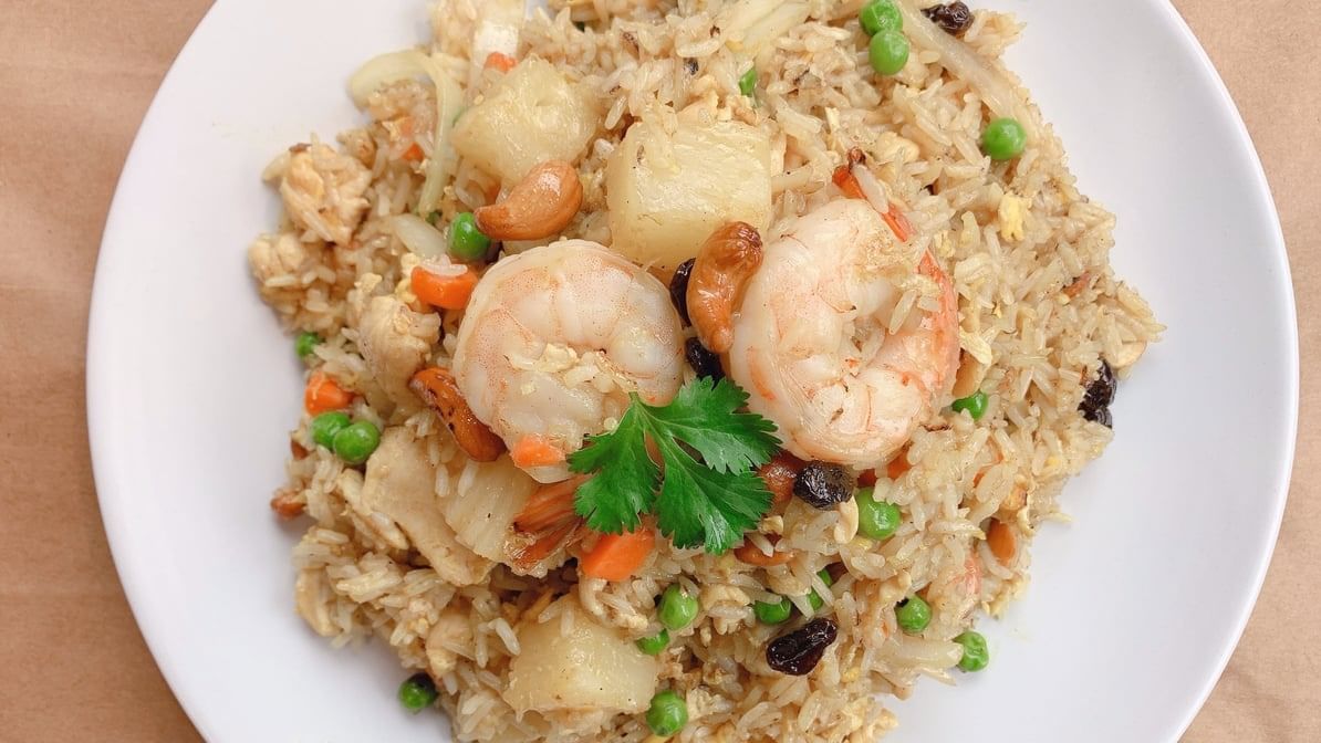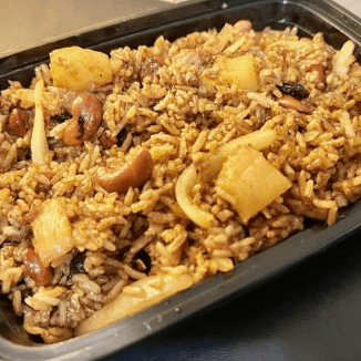 Fried rice with onions, pineapples, raisins, cashew nuts, shrimps, and chicken