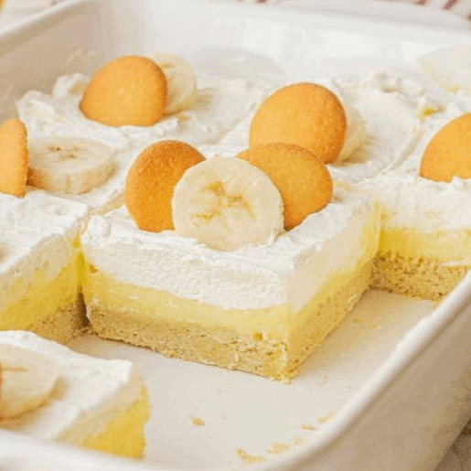 Creamy banana pudding and whipped cream over a soft cake base, topped with vanilla wafers and banana slices.