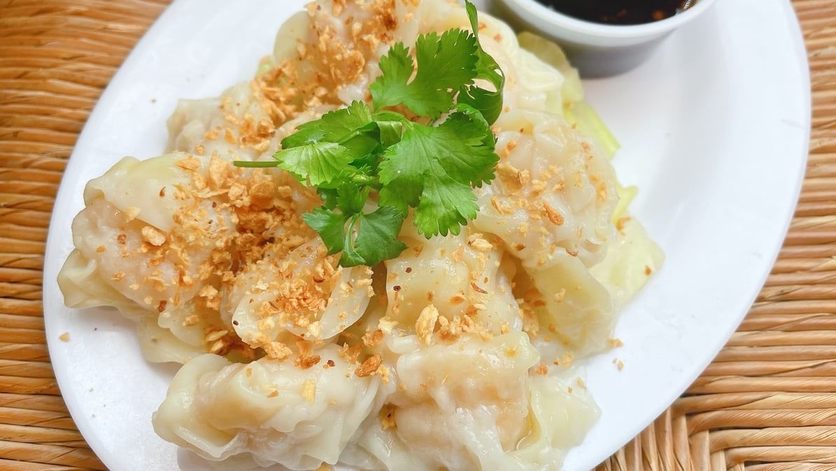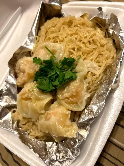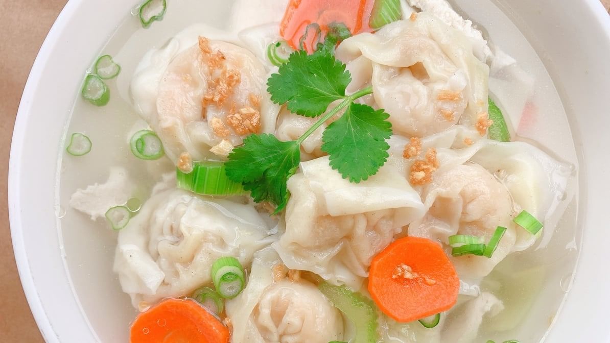 Egg noodles soup with shrimp wontons, chicken, bean sprout, green onion, cilantro with chicken broth