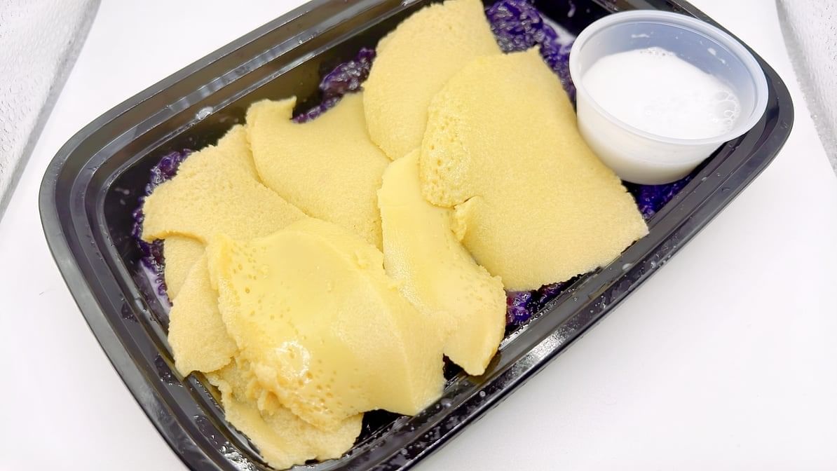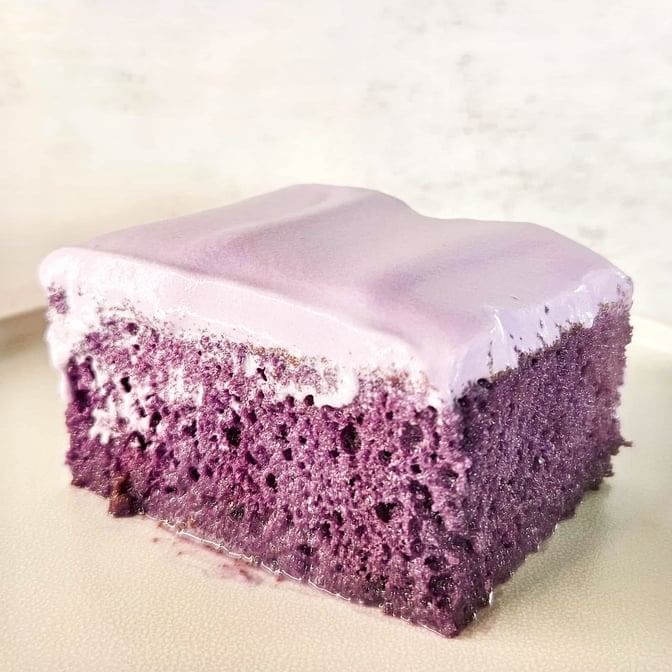 Moist sponge cake infused with ube, topped with a creamy three-milk sauce.