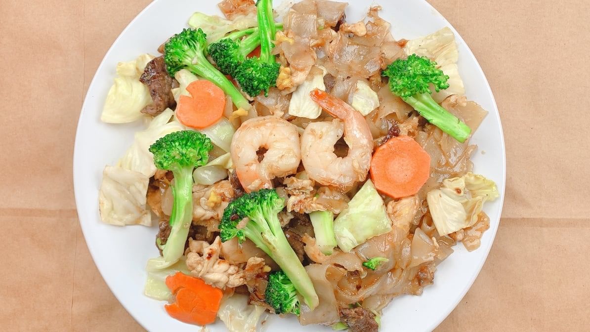 Pan fried rice noodles with choice of meat, bean sprouts, cabbage, carrot, mushrooms & egg