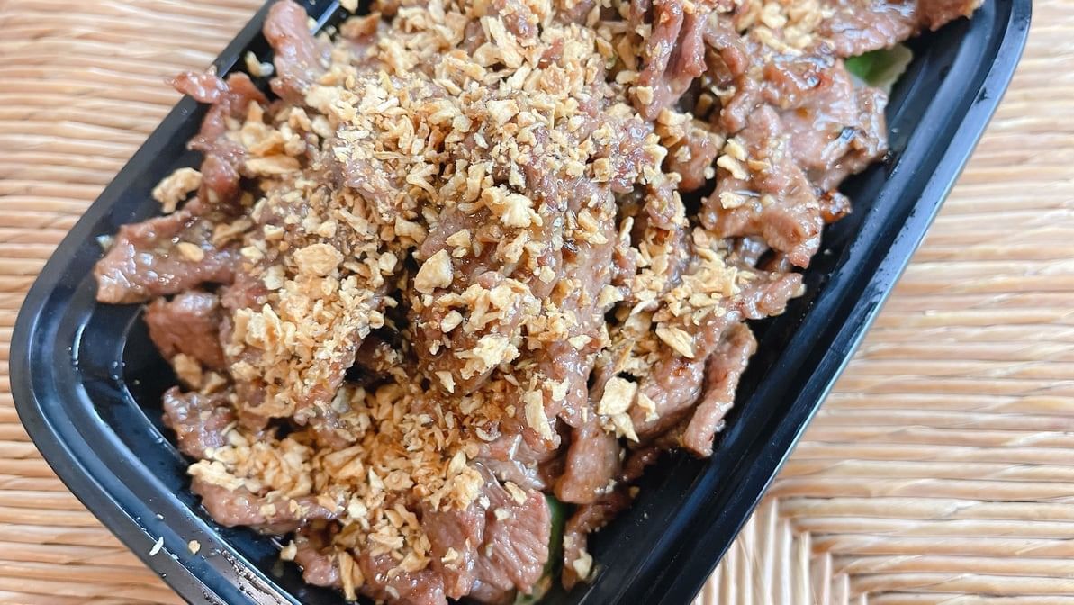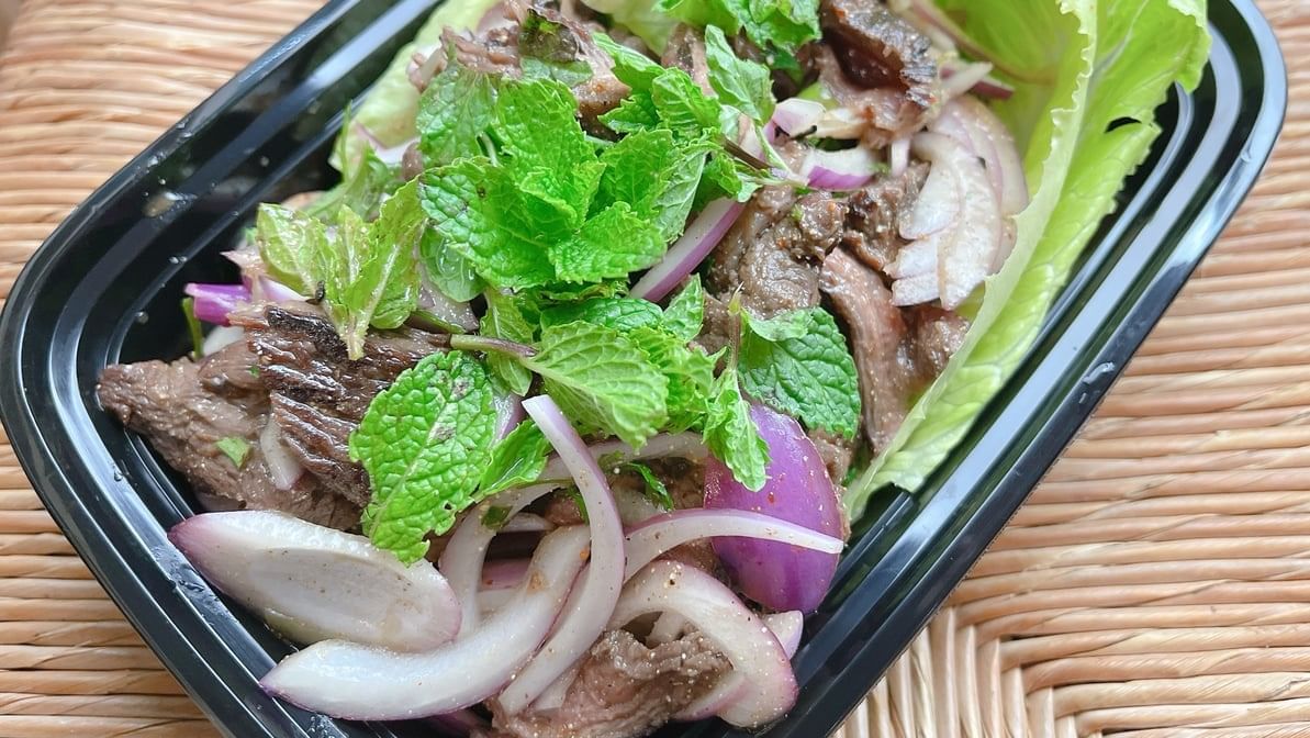 Sliced grilled beef mixed with red onion, crush roasted rice, cilantro in chili lime juice and mint leaves