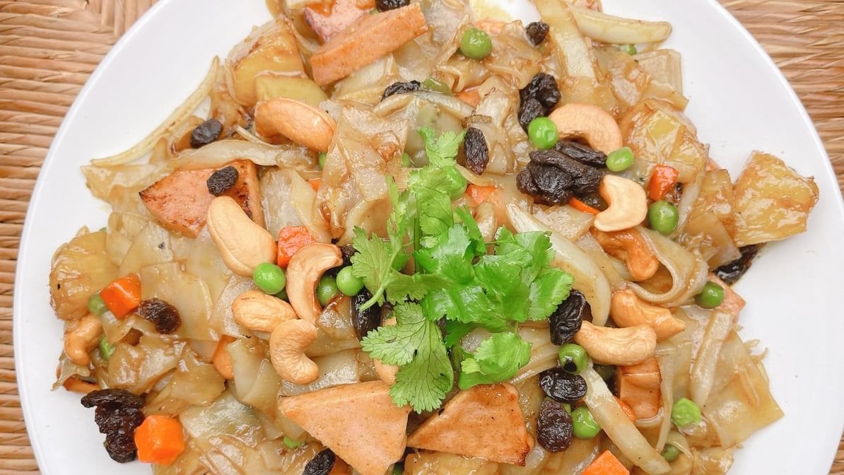 Stir fried rice noodles with onions, pineapples, raisins, cashew nuts, curry powder, and vegan ham