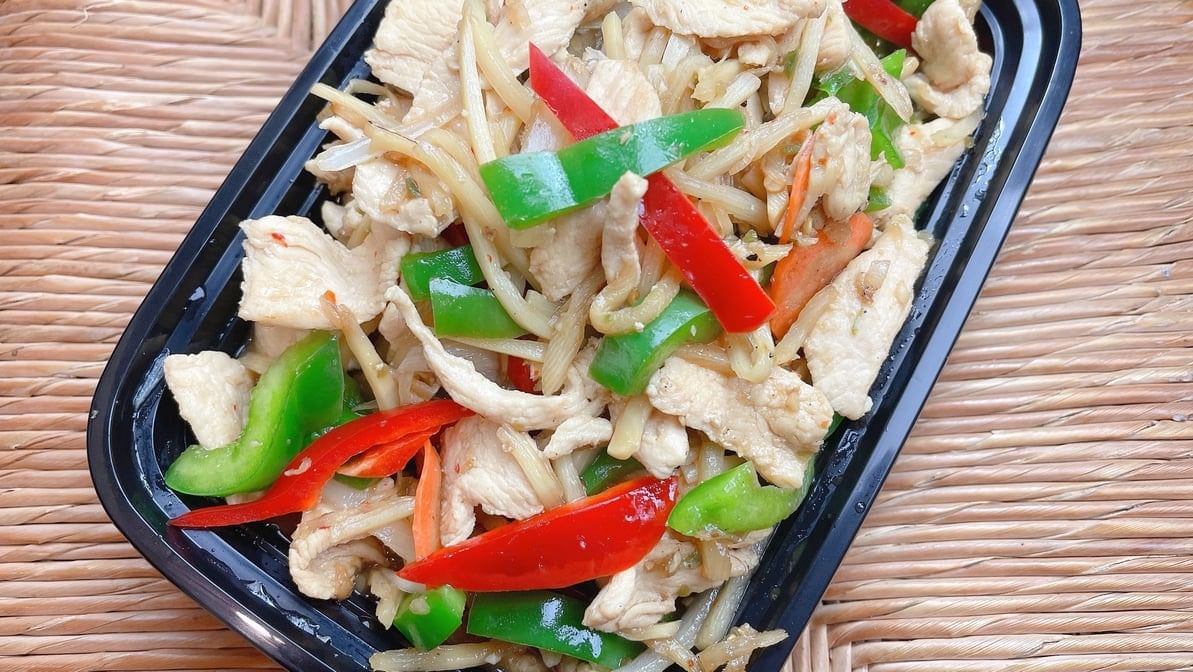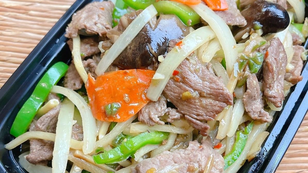 Stir fried meat in garlic chili sauce, onions, bamboo strips and bell pepper. Rice option available.