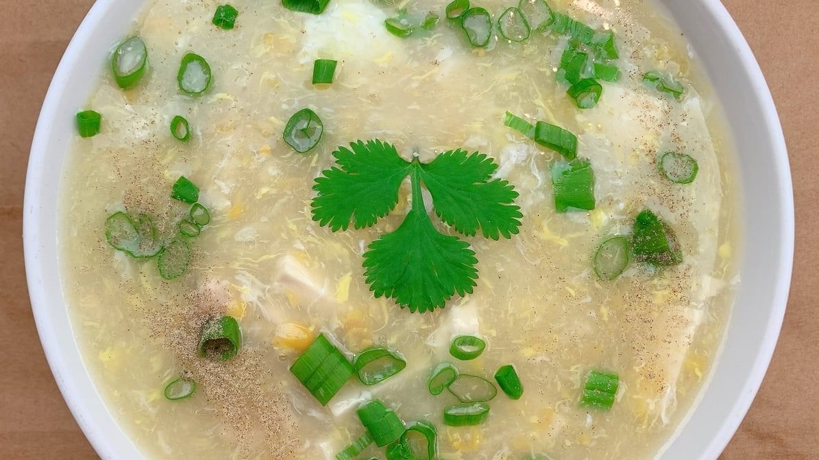 Thick egg base soup with chicken, tofu and sweet corn