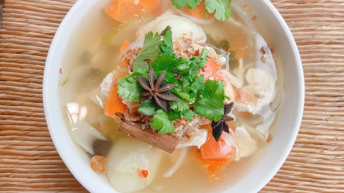 Thai spicy & sour soup with chicken, potato, onion, carrot, celery and Thai herb