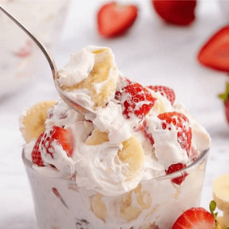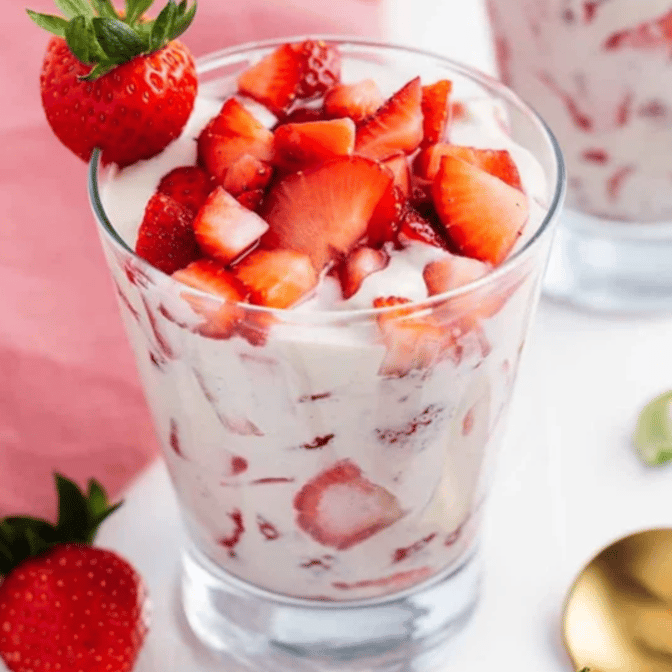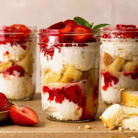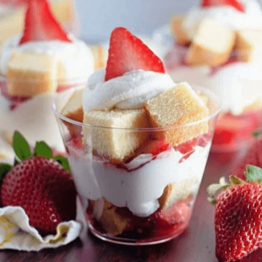 Sweet strawberries layered with whipped cream in a shortcake cup.