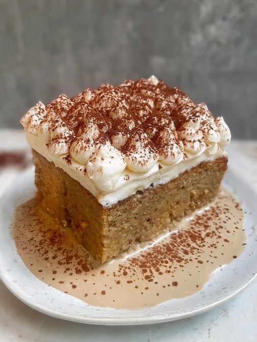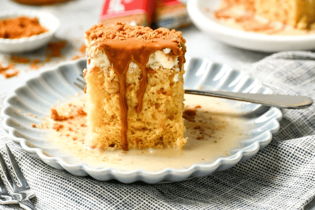 Decadent cake soaked in three milks, topped with Biscoff for a rich, caramelized finish.