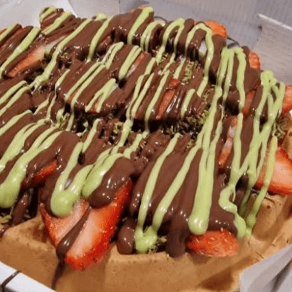 Indulge in a warm waffle topped with fresh strawberries, offering a delightful sweet treat.