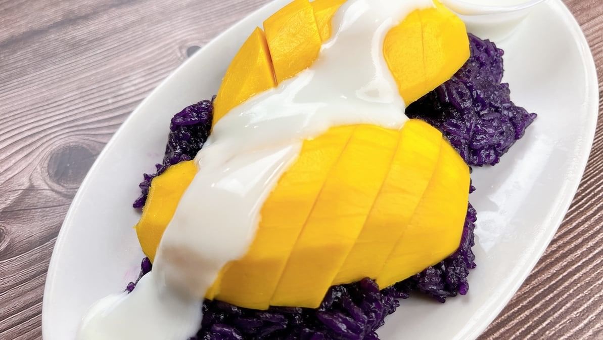 Sweet and creamy Thai-inspired dessert featuring coconut custard served with sticky rice.