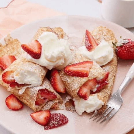 Delight in a sweet roti filled with fresh strawberries and cream, perfect for a fruity indulgence.