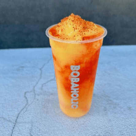 Strawberry purée with fresh cream and a strong shot of matcha green tea Large size 24 OZ only. Fresh mango purée with sweetened fresh cream and top of strong shot of matcha green tea. Large size only