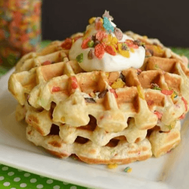 Colorful waffle topped with Fruity Pebbles for a sweet, crunchy delight.