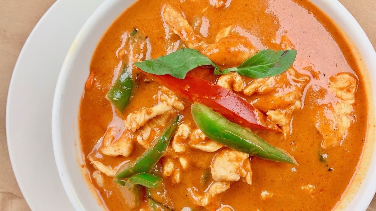 Red curry, coconut milk, basil, bell peppers and bamboo shoots