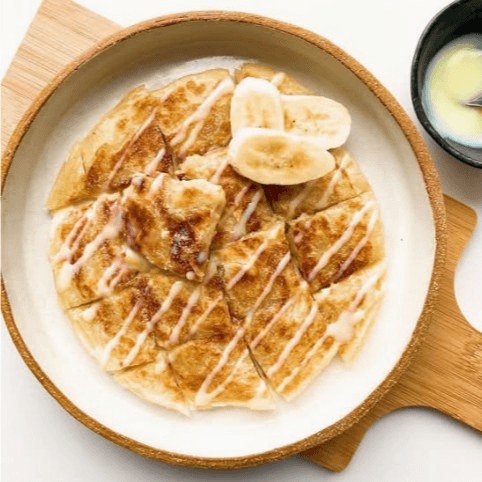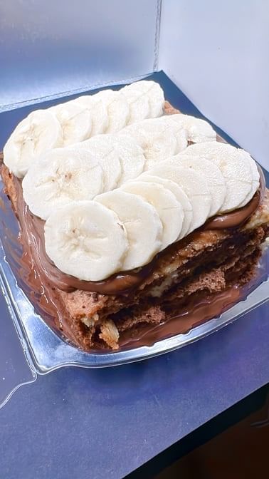 Warm, flaky roti layered with creamy banana pudding and fresh banana slices, finished with a sweet drizzle.