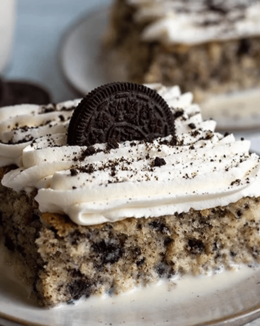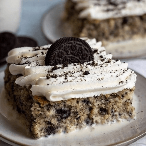 Moist sponge cake soaked in three types of milk, topped with Oreo crumbs.