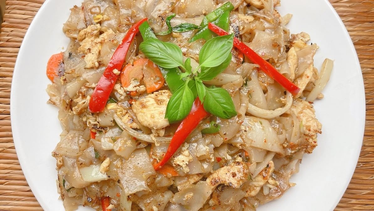 Spicy rice noodles with bell peppers, egg, onions, and basil leaves