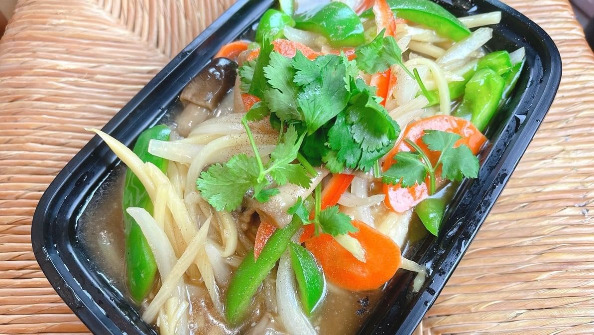 Stir fried bamboo shoot, onion, mushroom and bell pepper. Rice option available.