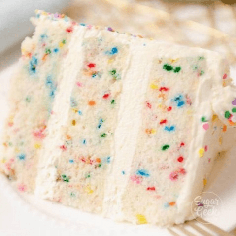 Moist cake loaded with colorful sprinkles, topped with a tangy cream cheese frosting.