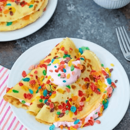 Sweet roti topped with vibrant Fruity Pebbles, creating a colorful and delightful dessert experience.