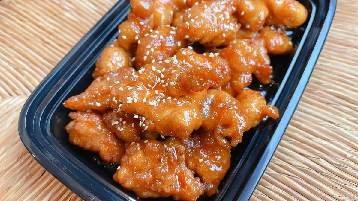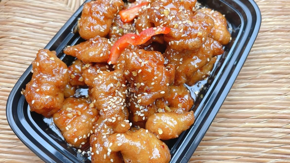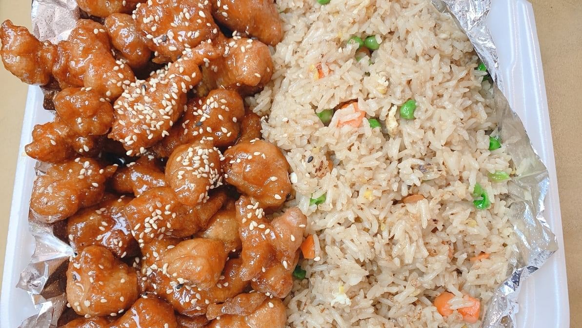 Deep fried battered chicken with orange sauce sprinkled with sesame seeds. Rice option available.