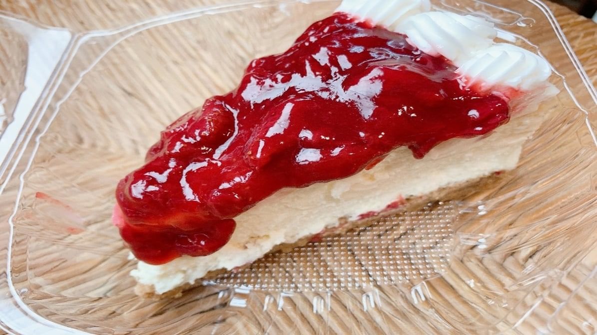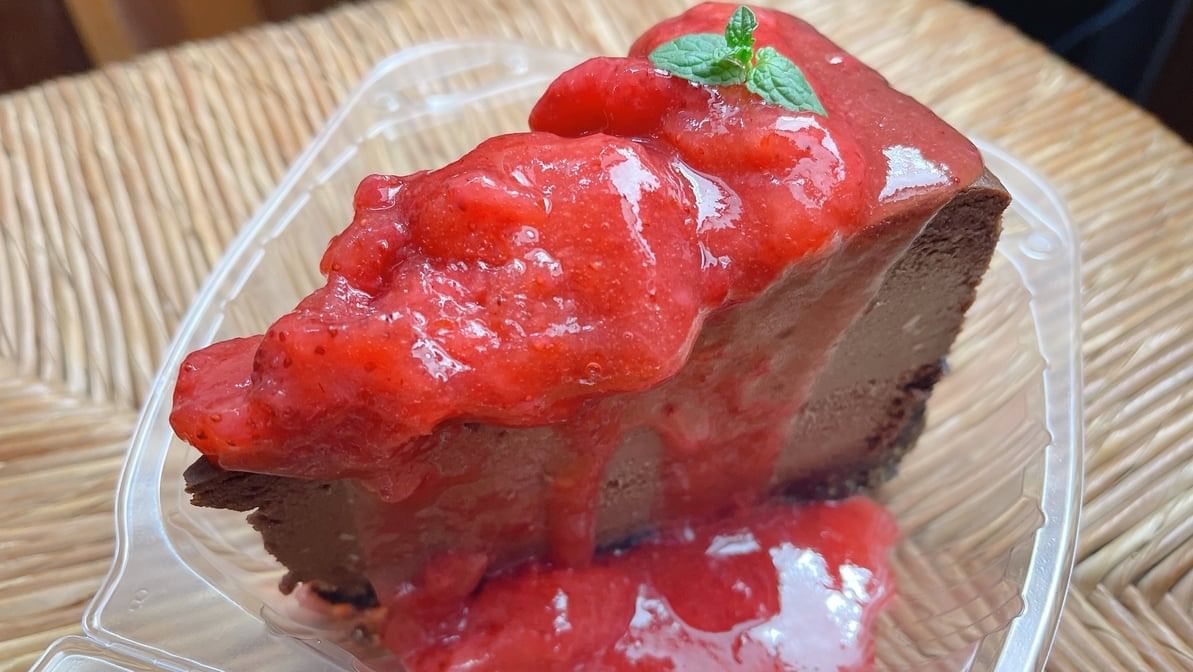 Rich and creamy cheesecake with sweet strawberry and chocolate flavors.