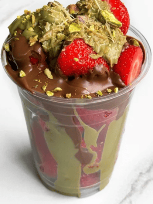 Indulge in a creamy pudding with Dubai chocolate, strawberries, and bananas for a delightful dessert experience.