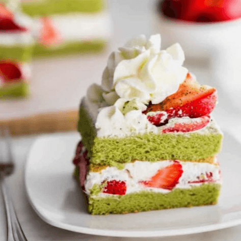 Fluffy matcha sponge layered with whipped cream and strawberries, topped with a swirl of cream. Seasonal.