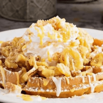 Warm waffle piled with banana pudding and banana slices, topped with whipped cream, cookie crumble, powdered sugar, and a drizzle.