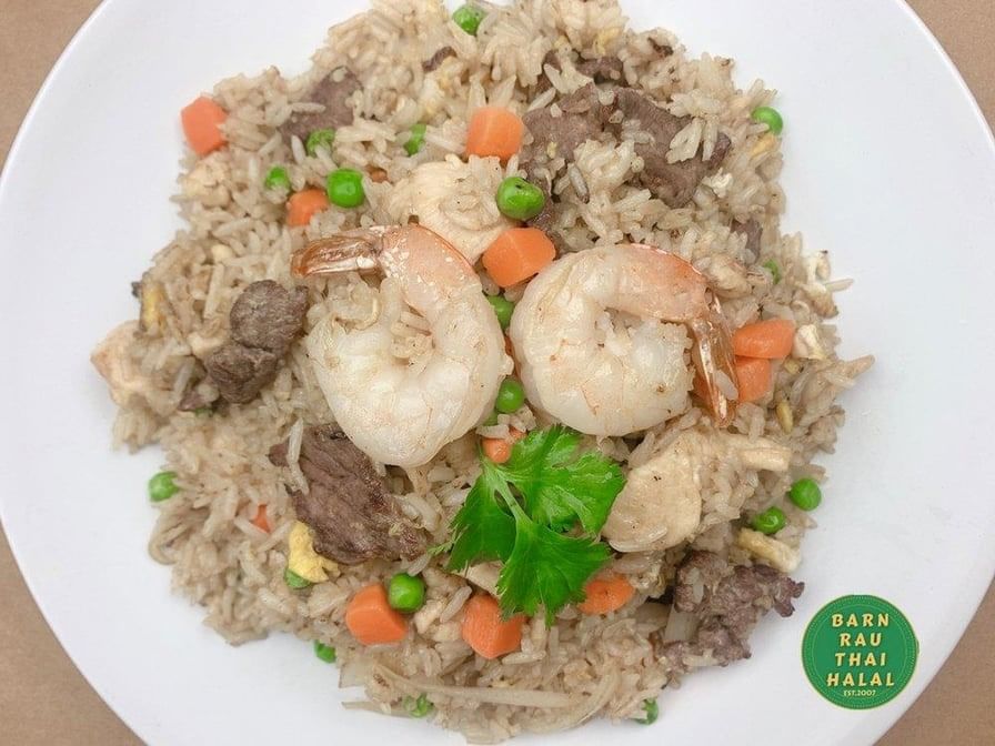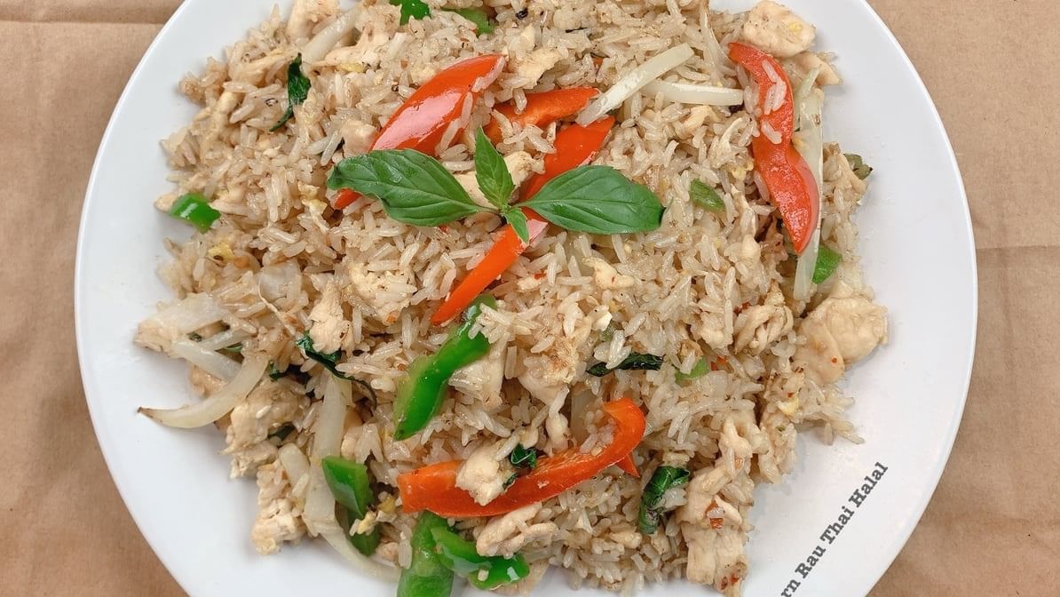 Spicy. Fried rice with basil leaves, eggs, combination of seafood, and bell peppers