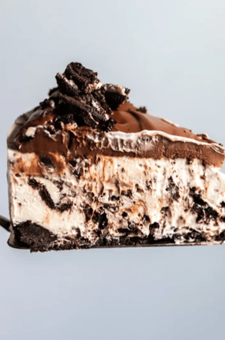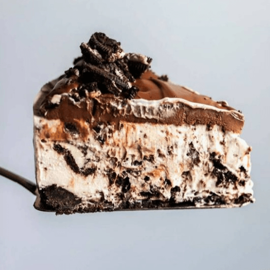 Rich and creamy cheesecake studded with Oreo cookie pieces, on an Oreo crust, finished with a chocolate topping.