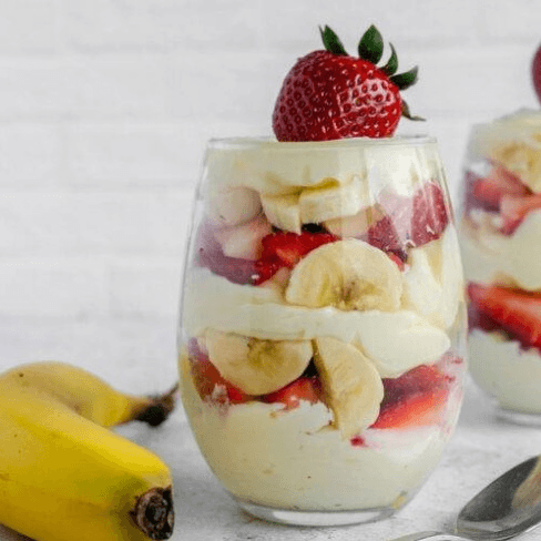 Creamy dessert cups filled with strawberries and banana.
