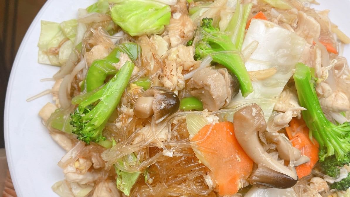 Stir fried glass noodles with eggs & vegetables.(choice of meat)
