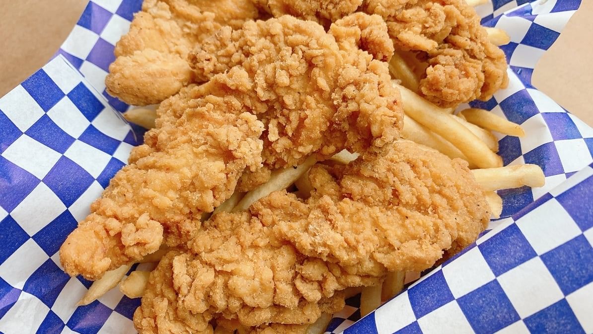 Deep fried chicken strip with buffalo sauce