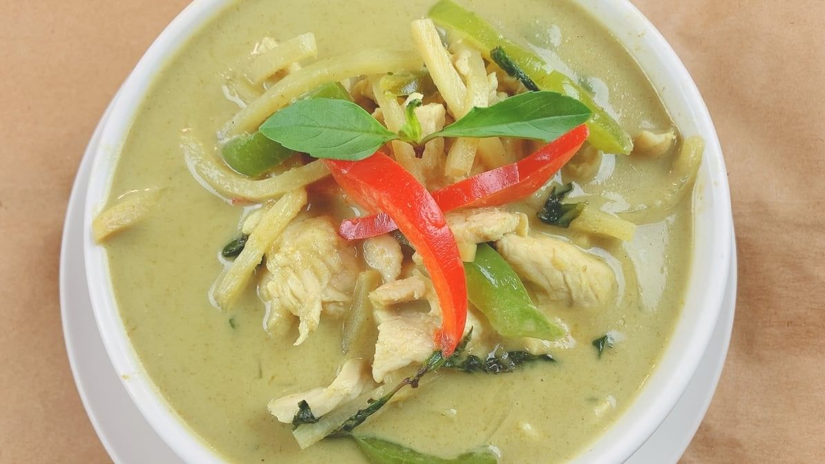 Green curry, coconut milk, basil, bell peppers and bamboo shoots. Start from medium high +
