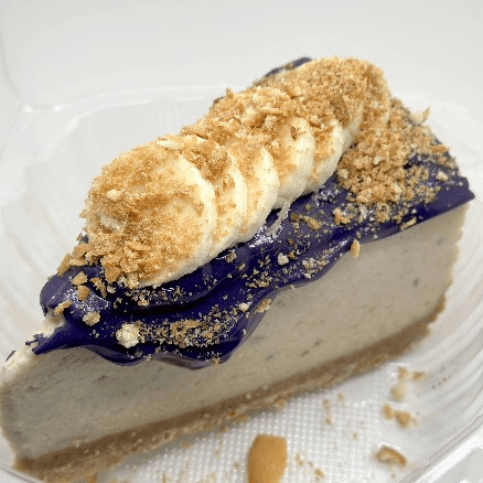 Rich and creamy banana pudding cheesecake on a crumb crust, topped with ube, banana slices, and crumble.