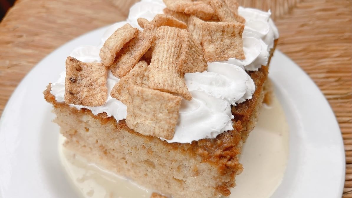 Moist sponge cake soaked in three types of milk, topped with fruity pebbles.