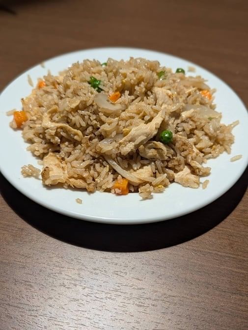 Fried rice with onions, eggs, peas, carrots, lots of fresh chopped garlic and top with crispy garlic